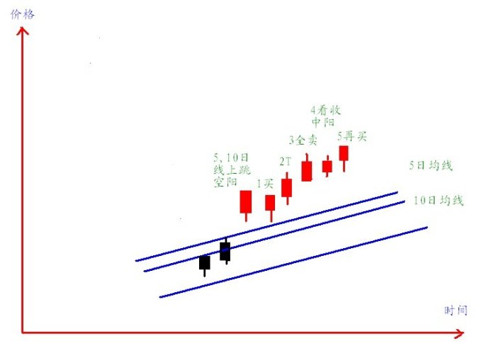 第一天逢低买入,称为一买,第二天T 0,第三天全出,第四天判断,如果收中阳,第五天可买入,如果收阴线可先放弃等待5日线回调20日均线不破又上翘时的基准买点,收十字星的话可以再看一天,如果后一天出现跳空阳最好,基准当天也可以买,如果买不到很低的价格就第二天逢低买,口诀熟时如出现新基准则按新基准算。