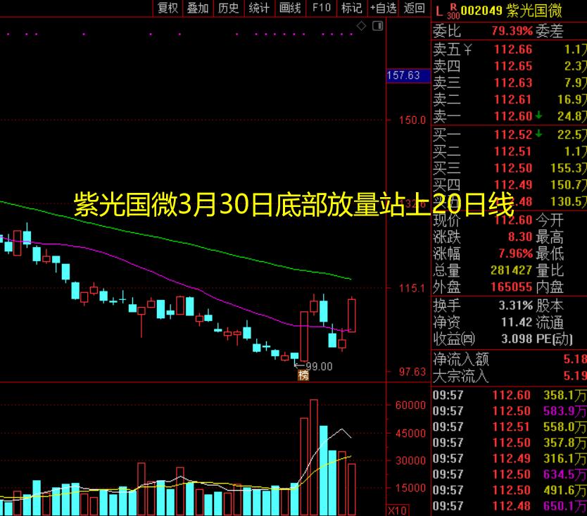 紫光国微3月30日股价底部放量站上20日线,上午紫光国微成交金额32亿的技术分析意义