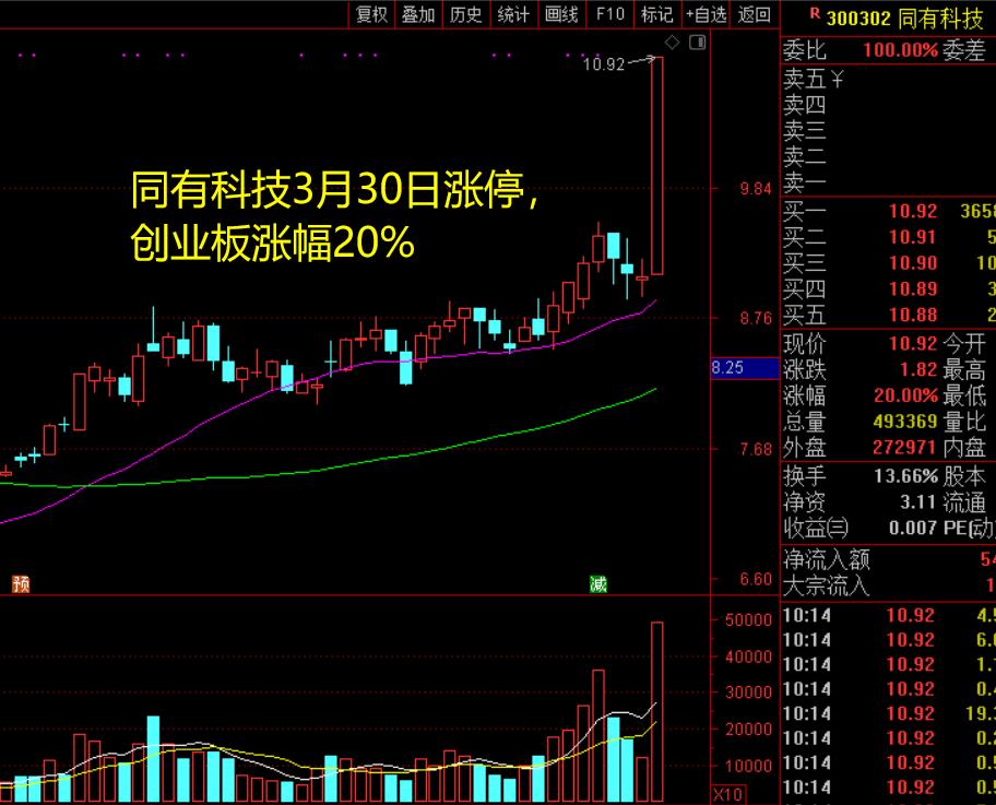 同有科技3月30日涨停板20%的原因?创业板300代码开头涨停是10%还是20%