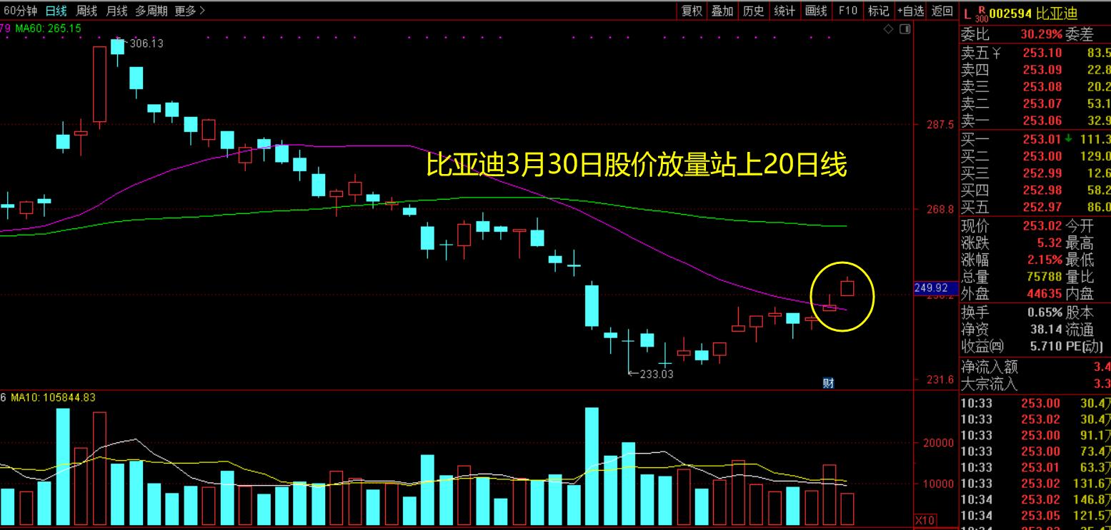 比亚迪股票近期为什么跌得这么厉害?3月30日股价涨2.38%放量站上20日均线就是主升浪