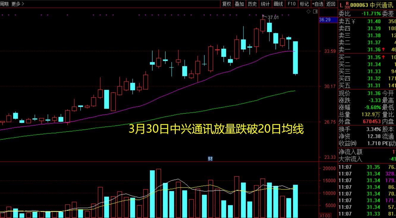 中兴通讯2023年为何不涨?3月30日股价跌-9.8%放量跌破20日均线