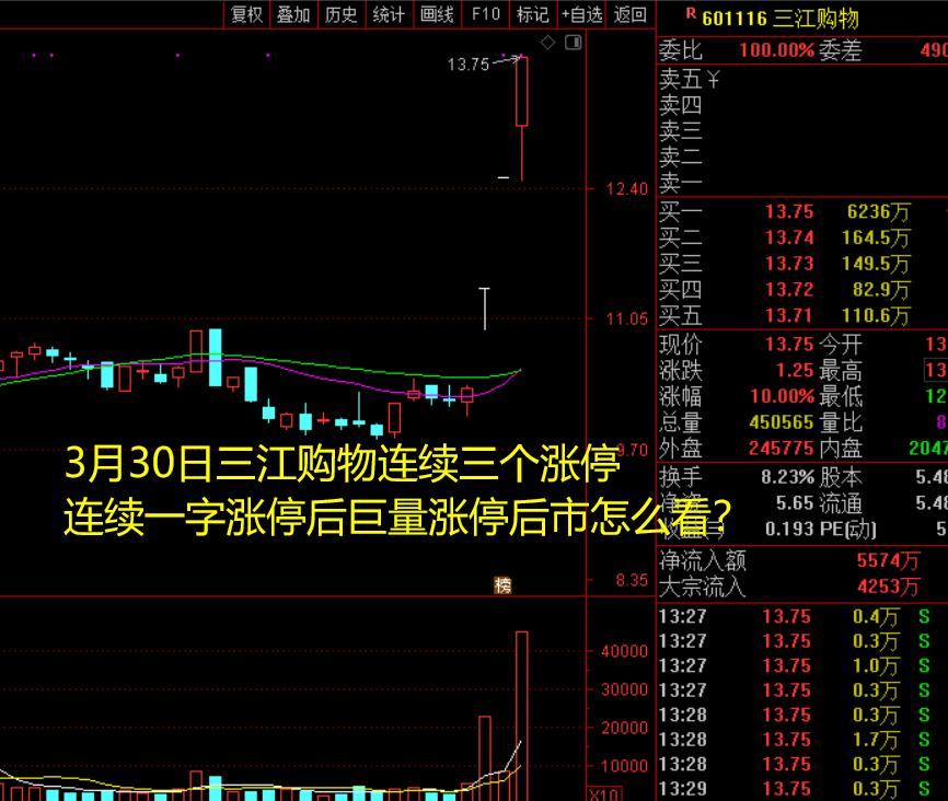 从三江购物3月30日连续3个涨停原因,探讨连续一字涨停板后巨量换手怎么操作