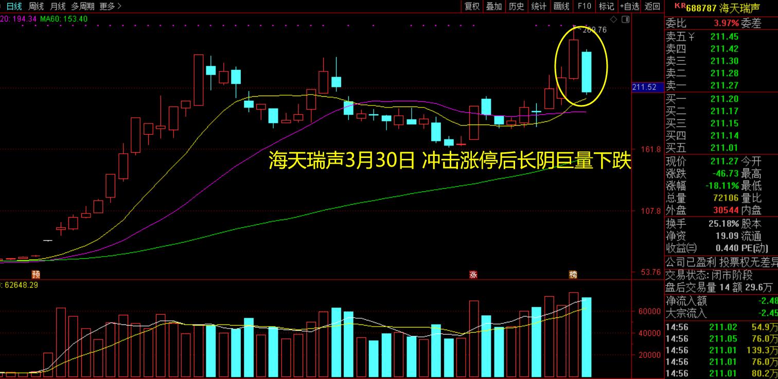 海天瑞声3月30日股价跌-18%,昨天涨停创新高第二天放量长阴下跌意味着什么