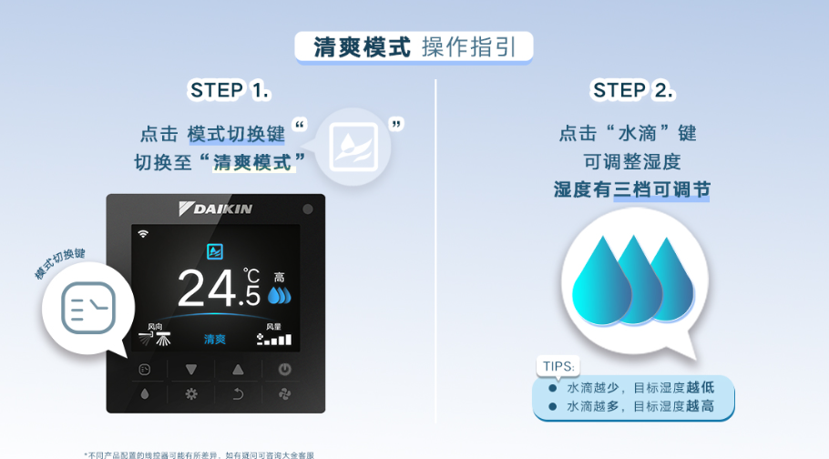 在潮湿闷热的夏季,采用大金三管制的“温湿平衡室内机”用户,大金官方建议一键开启【清爽模式】。考虑不同用户的湿度需求,提供三挡除湿力度灵活选择,同时风量与风向均可自由调节,轻松打造舒适空气环境。
