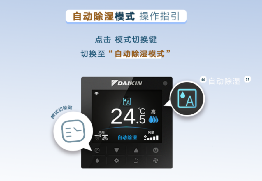 考虑到更加便捷的操作,采用大金三管制“温湿平衡室内机”“衣帽间专用室内机”的用户,大金官方建议一键开启【自动除湿】模式。当湿度(RH)高于70%时,自动除湿模式会感应并启动,而当湿度降至60% 以下时则会自动关闭,一键托管,智能除湿防霉,免去手动开关、调湿的操作步骤,解放双手,省心又舒适。