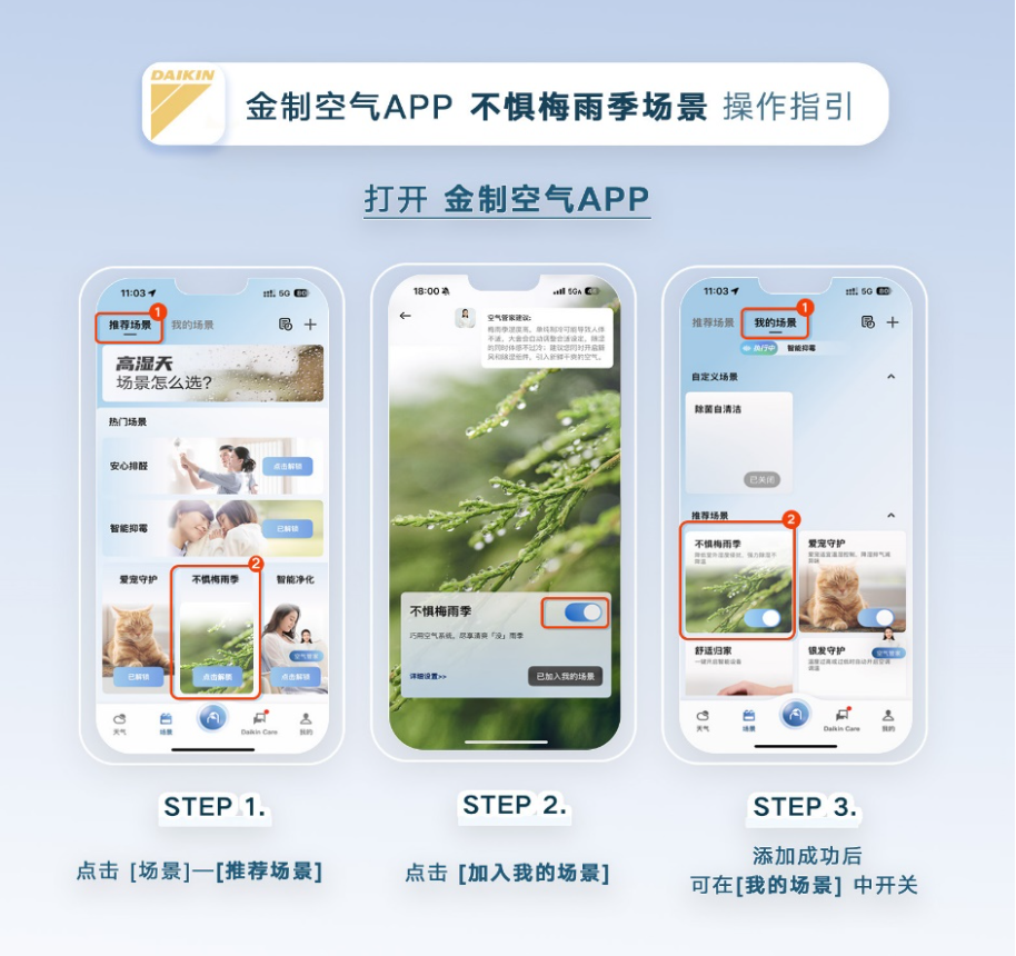 考虑到空气流通及清新洁净的空气需求,安装了大金中央空调与新风系统的用户,大金官方建议在金制空气APP上一键开启【不惧梅雨季】场景模式,空调与新风将智能联动协同运行。空调高效除湿缓解潮湿感,新风系统减少室外潮湿空气的引入,同步维持室内含氧量充足,实现通风、舒爽两不误。