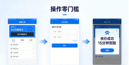 其次是小程序操作 “零门槛” ,不用下载 APP,不用复杂注册。打开微信,直接搜索 “京质回收” 小程序就能进入,首页分类导航清晰明了:电商卡券、商超卡券、影音会员、出行服务、餐饮礼品卡等板块一目了然,就算是不擅长用手机的长辈,也能跟着指引找到对应卡种。以回收沃尔玛购物卡为例,全程就 3 步:选择 “商超卡券”→“沃尔玛购物卡”→填写卡号卡密→提交申请,不到 2 分钟就出核价结果,确认后 15 分钟内就完成核销到账,比转卖节省了至少半天时间。