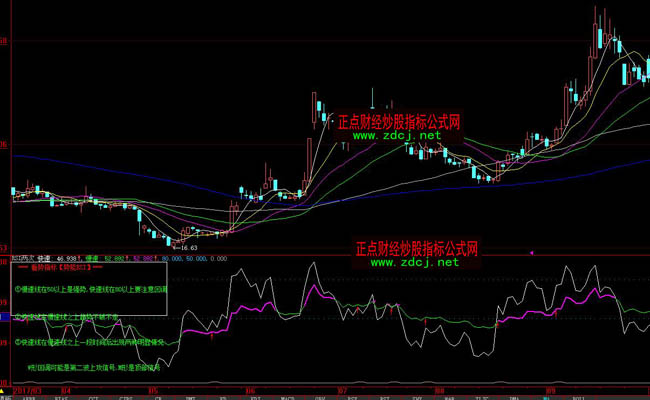 DRAWTEXTREL(5,200,'①慢速线在50以上是强势,快速线在80以上要注意回调'),COLOR00FF00,LAYER0;