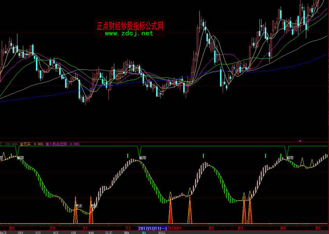 短卖:IF(CROSS(慢线,快线) AND (慢线>75),85,100),COLOR008000,LINETHICK2;