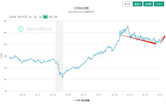 这次的美元加息周期是极为特殊的周期,是下行周期的高通胀,被迫加息,供给不足的问题在高利率的情况下又无法解决,反而由于短期高利率可能消灭了很多存量供给,这就为下次利率转向的通胀埋下伏笔。如果看路透CRB商品指数,整个大宗商品在加息周期也是平稳下行,7月底,中国需求刺激预期叠加美元利率拐点预期,立刻又拐头向上。