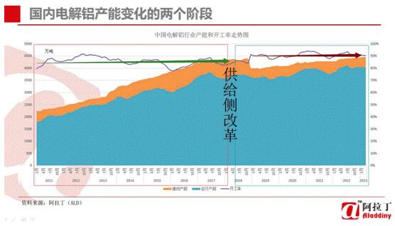 2017年开始我国对电解铝实施供给侧改革,2018年颁布的《关于电解铝企业通过兼并重组等方式实施产能置换有关事项的通知》确立了我国电解铝产能天花板为4500万吨,以控制行业产能的无序增长。根据阿拉丁数据,2022年我国电解铝产能已达4418万吨,全年产量4004万吨,产能利用率达90.64%,接近饱和状态。