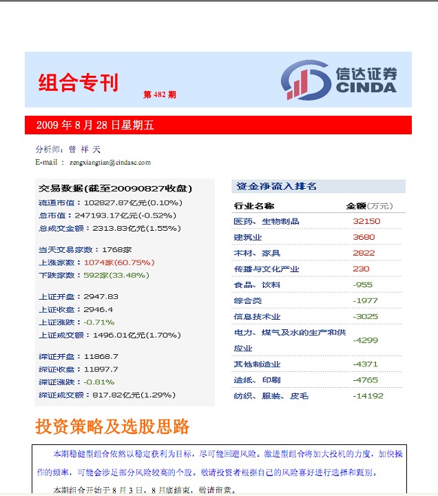 8月28日信达证券组合专刊