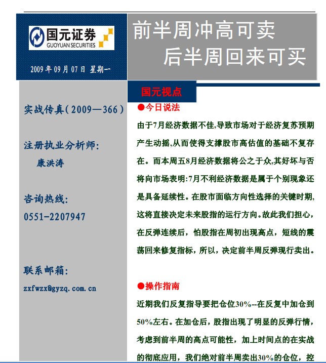 9月7日国元证券实战传真