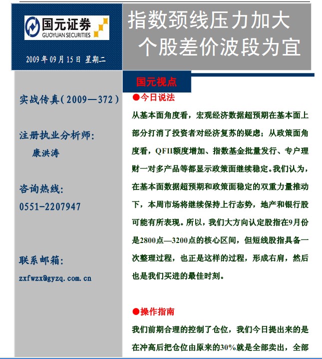 国元证券实战传真从基本面角度看,宏观经济数据超预期在基本面上部分打消了投资者对经济复苏的疑虑;从政策面角度看,QFII额度增加、指数基金批量发行、专户理财一对多产品等都显示政策面继续稳定。 我们认为,在基本面数据超预期和政策面稳定的双重力量推动......