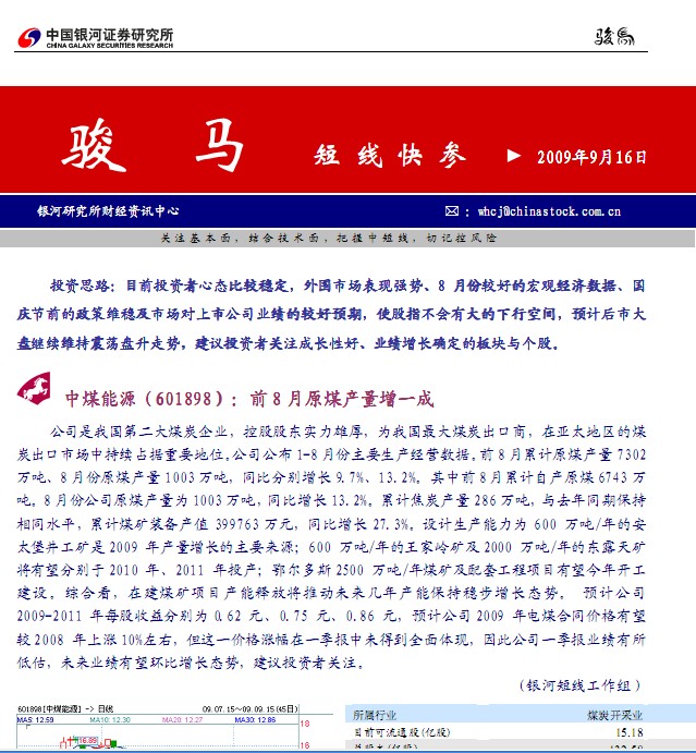 银河证券骏马(短线快参):中煤能源( 601898 ):前 8 月原煤产量增一成 公司是我国第二大煤炭企业,控股股东实力雄厚,为我国最大煤炭出口商,在亚太地区的煤炭出口市场中持续占据重要地位。公司公布 1-8 月份主要生产经营数据。前 8 月累计原煤产量 7302..........