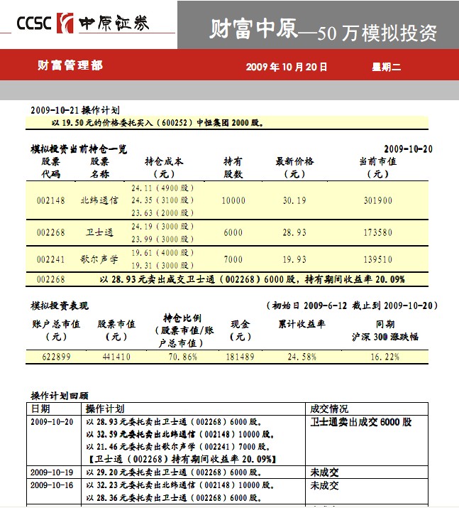 中原证券策略研究:50万模拟投资: