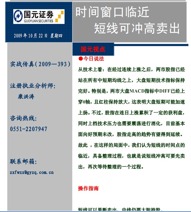 国元证券实战传真:今日说法:从技术上看:在经过连续上涨之后,两市股指已经站在所有中短期均线之上,大盘短期技术指标保持完好。特别是,两市大盘MACD指标中DIFF已经上穿0轴,且红柱保持放大,这表明大盘短期可能加速上扬。不过,股指在连日上涨累积了一定的获利盘,同时上档技术压力也需要震荡进行消化,目前基本面向好预期未改,股指走高的趋势有望得到延续。故此 ,在这样的局面中,我们认为短线的时间点的临近,具备整理过程,也就是说短线冲高可要先卖出,再次等待整理的一个过程。操作指南 短线可以果断卖出,中线仍要大胆持股.......