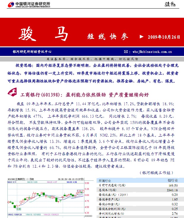 银河证券骏马(短线快参):关注基本面,结合技术面,把握中短线,切记控风险;投资思路:国内外经济复苏态势不断明朗,企业盈利将持续改善,全社会流动性处于合理充裕状态,市场估值仍有一定上升空间,四季度市场运行中枢还将震荡上移。投资机会上,投资者可重点选择强周期性板块和资产价格泡沫预期下的资源板块,推荐金融、房地产、有色、煤炭。工商银行(601398):盈利能力依然强劲 资产质量继续向好截至 09 年上半年末, 工行总资产 11.44 万亿元,比年初增长 17.2%。贷款余额增长 18.9%;存款增长 15.9%。上半年为提高资金运用效率和收益,公司加大资金运作力度,买入返售金融资产较年初增长 477%。上半年实现净利润 666.13 亿元, 同比增长 2.7%;每股收益 0.20 元,符合预期。不良贷款保持双降,全年仍可能继续双降。公司全年实现 150%的拨备覆盖率不会面临很大的拨备计提压力。期末拨备覆盖率 138.2%,较年初提升 8.05 个百分点。NIM 企稳回升势头明显,投行业务对中间业务贡献不菲。6 月单月 NIM2.25%,环比上升 18 个基点。上半年手续费及佣金净收入增长 13.3%,增速比 1 季度提高 3.6 个百分点。投行业务收入同比增量占手续费及佣金收入增量的 60.7%。投行业务值得期待。全资子公司工银国际控股已于 08 年获得投资银行业务牌照,有利于工行在香港投行业务的优化。工行在行业低迷期盈利能力下滑幅度慢于同业平均,表现出了较好的抗风险性。不过基于经济步入复苏的预期,目前公司 09 年动态 PE 和 PB 分别为 12.4 和 2.3 倍,估值安全性较高,建议投资者关注......