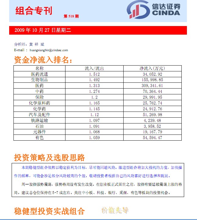 信达证券组合专刊:本期稳健型组合依然以稳定获利为目标,尽可能回避风险。激进型组合将加大投机的力度,加快操作的频率,可能会涉足部分风险较高的个股。敬请投资者根据自己的风险喜好进行选择和甄别。周一股指强势震荡,强势格局没有发生改变。在创业板正式面世之前,股指有望延续震荡上涨的格局。建议总仓位保持在5-7成左右。关注中小板、科技、银行、采掘、有色等板块的投资机会.......