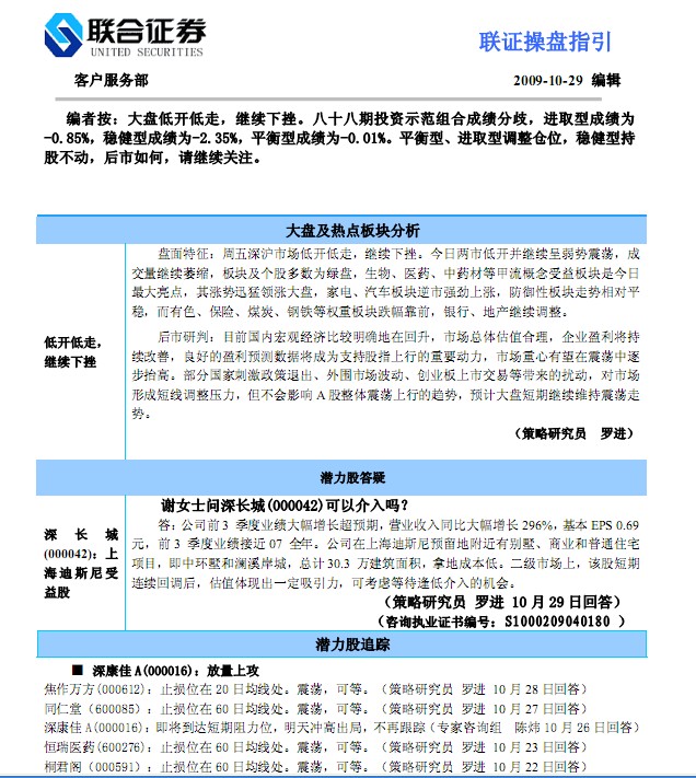 联合证券操盘指引:盘面特征:周五深沪市场低开低走,继续下挫。今日两市低开并继续呈弱势震荡,成交量继续萎缩,板块及个股多数为绿盘,生物、医药、中药材等甲流概念受益板块是今日最大亮点,其涨势迅猛领涨大盘,家电、汽车板块逆市强劲上涨,防御性板块走势相对平稳,而有色、保险、煤炭、钢铁等权重板块跌幅靠前,银行、地产继续调整。后市研判:目前国内宏观经济比较明确地在回升,市场总体估值合理,企业盈利将持续改善,良好的盈利预测数据将成为支持股指上行的重要动力,市场重心有望在震荡中逐步抬高。部分国家刺激政策退出、外围市场波动、创业板上市交易等带来的扰动,对市场形成短线调整压力,但不会影响 A股整体震荡上行的趋势,预计大盘短期继续维持震荡走势.......
