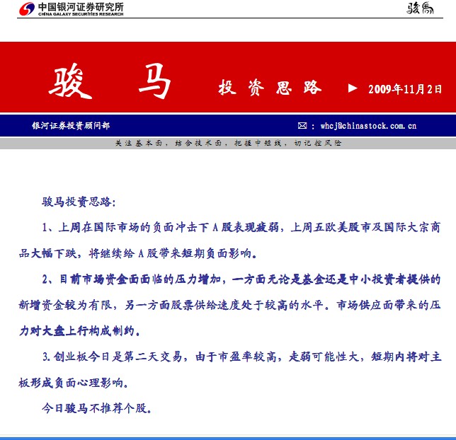 骏马投资思路 :1上周在国际市场的负面冲击下上周在国际市场的负面冲击下A股表现疲弱 股表现疲弱,上周五欧美股市及国际大宗商品大幅下跌,将继续给将继续给A 股带来短期负面影响........