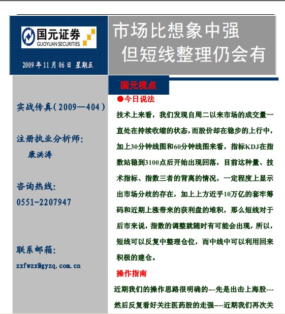 ●今日说法 技术上来看,我们发现自周二以来市场的成交量一直处在持续收缩的状态, 而股价却在稳步的上行中,加上30分钟线图和60分钟线图来看,指标KDJ在指数站稳到3100点后开始出现回落,目前这种量、技术指标、指数三者的背离的情况,一定程度上显示出市场分歧的存在,加上上方近乎10万亿的套牢筹码和近期上涨带来的获利盘的堆积,那么短线对于后市来说,指数的调整就随时有可能会出现,所以,短线可以反复中整理仓位,而中线中可以利用回来积极的建仓。 .......