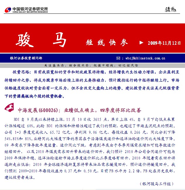 中海发展(600026):业绩低点确立,四季度将环比改善 BDI 自 9 月底以来持续上涨,11 月 10 日收 3615 点,单日上涨 4%,自 9 月下旬低点来累计涨幅超过 60%。此轮 BDI 的涨幅和持续性超过了我们的预期,也超过了市场主流观点的预期。公司 1-3 季度完成收入 65.72 亿元、净利润 9.06 亿元、每股收益 0.266 元,同比分别下降 54%、81%和 81%。业绩同比大幅度下降的原因在于沿海煤炭运价和远洋油轮运价同比大幅度下降。 09 年需求下降导致年度运量、运价同比下跌,考虑到年底由于冬季用煤需求增加可能导致运价继续回升, 以及 2010 年煤炭需求回升带来的运价回升,我们预计 2010 年公司合同运价可能与 2009 年保持平稳。远洋油轮运输市场三季度运价环比二季度略有回升,2010 年随着需求回升将逐渐走出低谷:2010 年全球经济逐渐复苏将带来油品需求缓慢回升,预计运价将缓慢回升。我们预测 2009-2010 年每股收益为 0.37 元和 0.50 元,目前 PB 水平为 2.2 倍,PB 处在历史底部,建议投资者关注 .........