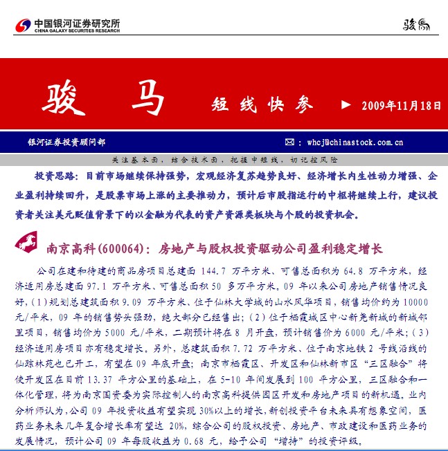 南京高科(600064):房地产与股权投资驱动公司盈利稳定增长 公司在建和待建的商品房项目总建面 144.7 万平方米、可售总面积为 64.8 万平方米,经济适用房总建面 97.1 万平方米、可售总面积 50 多万平方米。09 年以来公司房地产销售情况良好, (1)规划总建筑面积 9.09 万平方米、位于仙林大学城的山水风华项目,销售均价约为 10000 元/平米,09 年的销售势头强劲,绝大部分已经售出; (2)位于栖霞城区中心新尧新城的新城邻里项目,销售均价为 5000 元/平米,二期预计将在 8 月开盘,预计销售价为 6000 元/平米; (3)经济适用房项目亦有稳定增长。另外,总建筑面积 7.72 万平方米、位于南京地铁 2 号线沿线的仙踪林苑也已开工,有望在 09 年底开盘;南京市栖霞区、开发区和仙林新市区“三区融合”将使开发区在目前 13.37 平方公里的基础上,在 5-10 年间发展到 100 平方公里,三区融合和一体化管理,将为南京国资委为实际控制人的南京高科提供园区开发和房地产项目的新机遇。业内分析师认为, 公司 09 年投资收益有望实现 30%以上的增长, 新创投资平台未来具有想象空间, 医药业务未来几年复合增长率有望达 20%,综合公司的股权投资、房地产、市政建设和医药业务的发展情况,预计公司 09 年每股收益为 0.68 元,给予公司“增持”的投资评级......