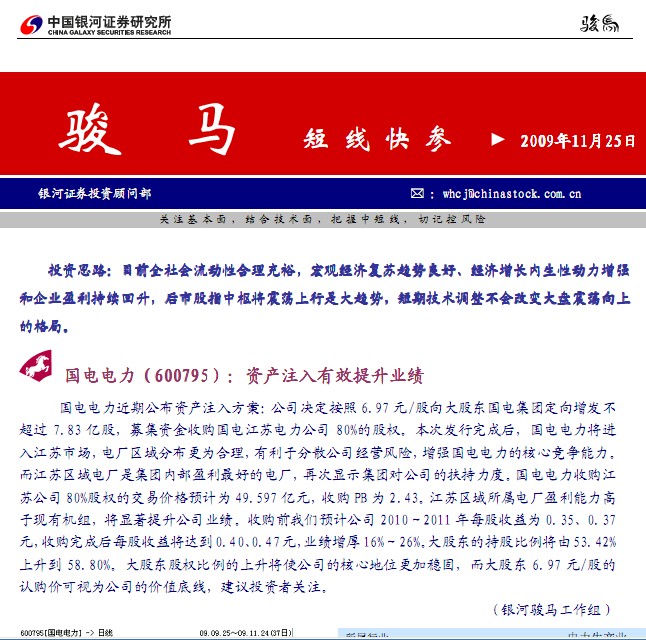 国电电力( 600795):资产注入有效提升业绩国电电力近期公布资产注入方案:公司决定按照 6.97 元/股向大股东国电集团定向增发不超过 7.83 亿股,募集资金收购国电江苏电力公司 80%的股权。本次发行完成后,国电电力将进入江苏市场,电厂区域分布更为合理,有利于分散公司经营风险,增强国电电力的核心竞争能力。而江苏区域电厂是集团内部盈利最好的电厂,再次显示集团对公司的扶持力度。国电电力收购江苏公司 80%股权的交易价格预计为 49.597 亿元,收购 PB 为 2.43。江苏区域所属电厂盈利能力高于现有机组,将显著提升公司业绩。收购前我们预计公司 2010~2011 年每股收益为 0.35、0.37 元,收购完成后每股收益将达到0.40、0.47元,业绩增厚16%~26%。大股东的持股比例将由53.42% 上升到 58.80%。大股东股权比例的上升将使公司的核心地位更加稳固,而大股东 6.97 元/股的认购价可视为公司的价值底线,建议投资......