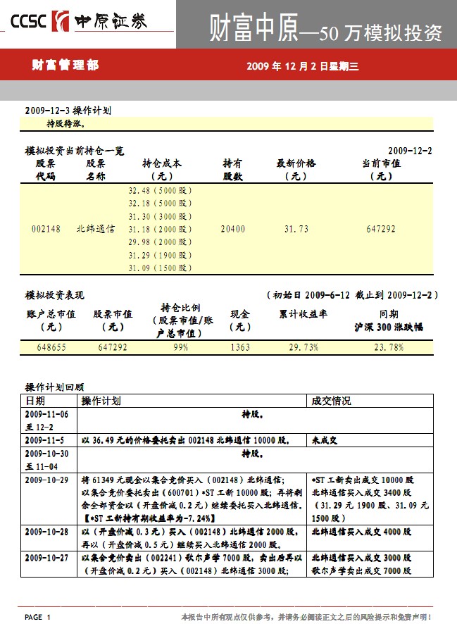 财富中原--50 万模拟投资说明: 本模拟投资于每日 17:30 前公布次日操作计划。 严格执行提前一日设定委托价格及数量的原则,若委托价格在当日股票交易价格范围内,即视为以委托价格成交全部委托数量。 本模拟投资初始资金为 50 万元人民币,投资标的为沪深证券交易所上市 A 股和权证,起始日期为 2009 年 06 月 12 日,其时沪深 300 收盘 2906.29 点......