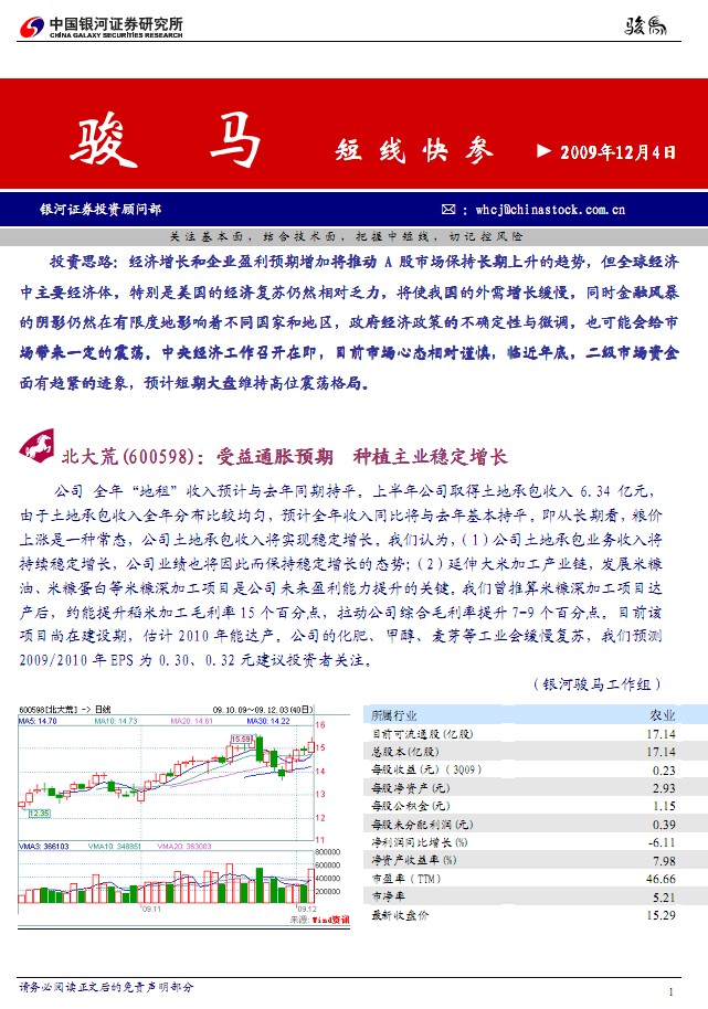 北大荒(600598):受益通胀预期 公司 全年“地租”收入预计与去年同期持平。上半年公司取得土地承包收入 6.34 亿元,由于土地承包收入全年分布比较均匀,预计全年收入同比将与去年基本持平。即从长期看,粮价上涨是一种常态,公司土地承包收入将实现稳定增长。我们认为,(1)公司土地承包业务收入将持续稳定增长,公司业绩也将因此而保持稳定增长的态势;(2)延伸大米加工产业链,发展米糠油、米糠蛋白等米糠深加工项目是公司未来盈利能力提升的关键。我们曾推算米糠深加工项目达产后,约能提升稻米加工毛利率 15 个百分点,拉动公司综合毛利率提升 7-9 个百分点。目前该.....