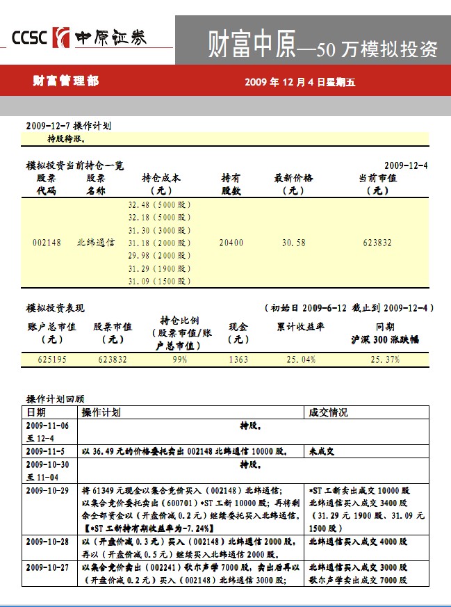 财富中原--50 万模拟投资说明: 本模拟投资于每日 17:30 前公布次日操作计划。 严格执行提前一日设定委托价格及数量的原则,若委托价格在当日股票交易价格范围内,即视为以委托价格成交全部委托数量。 本模拟投资初始资金为 50 万元人民币,投资标的为沪深证券交易所上市 A 股和权证,起始日期为 2009 年 06 月 12 日,其时沪深 300 收盘 2906.29 点.......