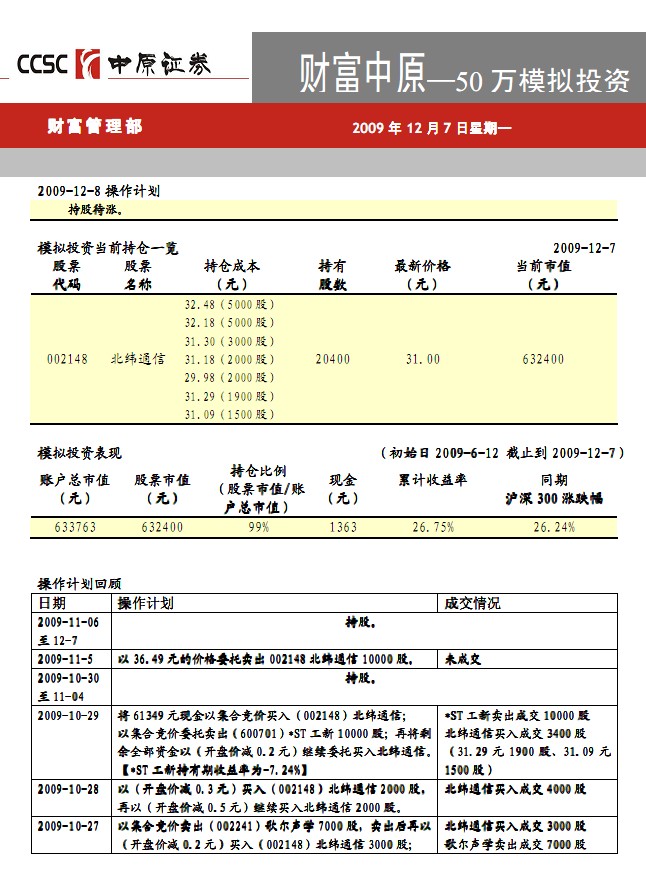 财富中原--50 万模拟投资说明: 本模拟投资于每日 17:30 前公布次日操作计划。 严格执行提前一日设定委托价格及数量的原则,若委托价格在当日股票交易价格范围内,即视为以委托价格成交全部委托数量......