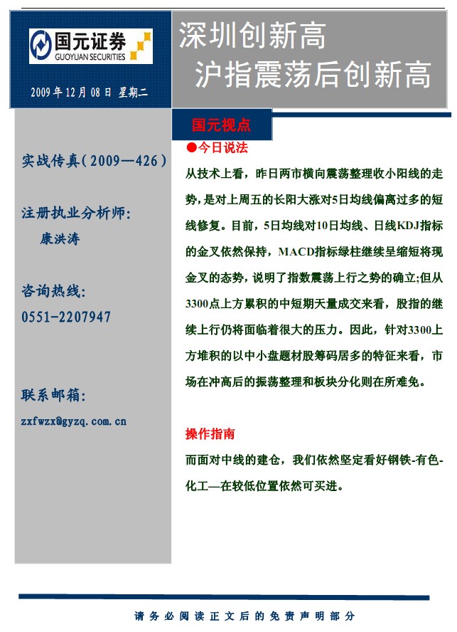 今日说法 从技术上看,昨日两市横向震荡整理收小阳线的走势, 是对上周五的长阳大涨对5日均线偏离过多的短线修复。目前,5日均线对10日均线、日线KDJ指标的金叉依然保持, MACD指标绿柱继续呈缩短将现金叉的态势, 说明了指数震荡上行之势的确立;但从 3300点上方累积的中短期天量成交来看,股指的继......