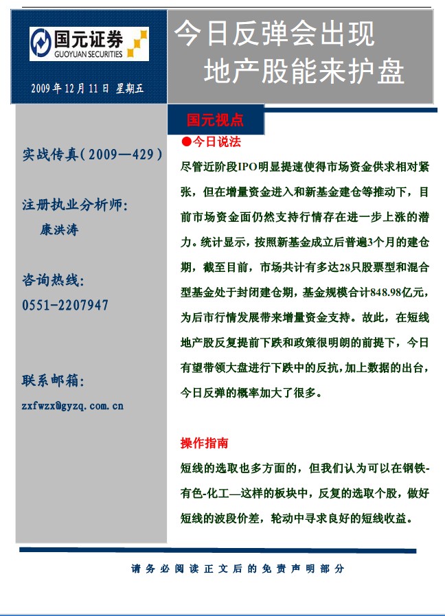 今日说法 尽管近阶段IPO明显提速使得市场资金供求相对紧张,但在增量资金进入和新基金建仓等推动下,目前市场资金面仍然支持行情存在进一步上涨的潜力。统计显示,按照新基金成立后普遍3个月的建仓期,截至目前,市场共计有多达28只股票型和混合型基金处于封闭建仓期,基金规模合计848.98亿元,为后市行情发展带来增量资金支持。故此,在短线地产股反复提前下跌和政策很明朗的前提下,今日有望带领大盘进行下跌中的反抗, 加上数据的出台......