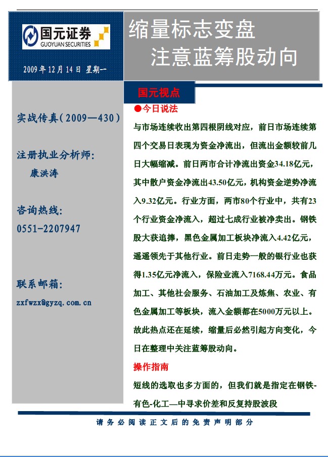 今日说法 与市场连续收出第四根阴线对应,前日市场连续第四个交易日表现为资金净流出,但流出金额较前几日大幅缩减。前日两市合计净流出资金34.18亿元,其中散户资金净流出43.50亿元,机构资金逆势净流入9.32亿元。行业方面,两市80个行业中,共有23 个行业资金净流入,超过七成行业被净卖出。钢铁股大获追捧,黑色金属加工板块净流入4.42亿元,遥遥领先于其他行业。前日走势一般的银行业也获得1.35亿元净流入,保险业流入7168.44万元。食品加工、其他社会服务、石油加工及炼焦、农业、有色金属加工等板块,流入金额都在5000万元以上。国元视点......