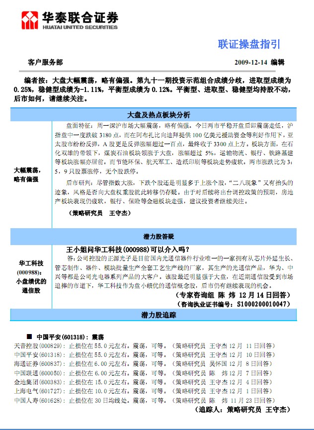 大盘及热点板块分析 大幅震荡, 略有偏强 盘面特征:周一深沪市场大幅震荡,略有偏强。今日两市平稳开盘后即震荡走低,沪指盘中一度跌破 3180 点,而在阿布扎比向迪拜提供 100 亿美元援助资金等利好作用下,亚太股市纷纷反弹,A股更是反弹涨幅超过一百点,最终收于 3300 点上方。板块方面,在石化双雄的带领下,煤炭石油板块领涨于大盘,涨幅超过 5%,运输物流、银行、铁路基建等板块涨幅亦居前。而节能环保、航天军工、造纸印刷等板块走势疲软。两市涨跌比为 3: 5,9 只股票涨停,无个股跌停。 后市研判:尽管指数大涨,下跌个股还是明显多于上涨个股, “二八现象”又有抬头的迹象,风格是否向大盘权重股就此转移仍存疑。由于对后续将出台调控政策的预期,房地产板块表现仍疲软,银行、保险等金融板块走强,建议投资者继续关注......