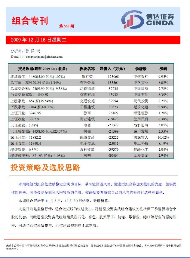 本期稳健型组合依然以稳定获利为目标,尽可能回避风险。激进型组合将加大投机的力度,加快操作的频率,可能会涉足部分风险较高的个股。敬请投资者根据自己的风险喜好进行选择和甄别。 本期组合开始于11月 3日,12月30日结束,敬请留意。 大盘目前是盘整行情,适合做短线的快进快出。稳健型投资实战组合建议关注社保三季度新增仓个股的机会;而激进型投资实战组继续关注石化、有色、航天军工、航运、零售业、港口等行业的强势品种。可适当仓位谨慎参与,仓位建议控制在 5成左右......