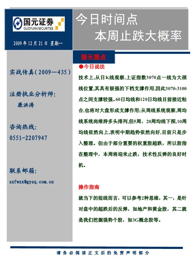 今日说法 技术上,从日K线观察,上证指数3070点一线为大颈线位置,其具有极强的下档支撑作用,因此3070-3100 点之间支撑较强。 60日均线和120日均线目前接近粘合,也将对大盘形成支撑作用;从周线系统观察,周均线系统尚维持多头排列,但5周、20周均线下探,10周均线依然向上,表明中期趋势依然向好,目前只是步入整理。但由于部分重要的权重股超跌,所以股指在整理中,本周将迎来止跌,技术性反弹的良好时机。 操作指南 就当下的短线而言,可以参考2种思维,其一,是针对盘中的超跌后的反弹,如地产和黄金股,其二就......