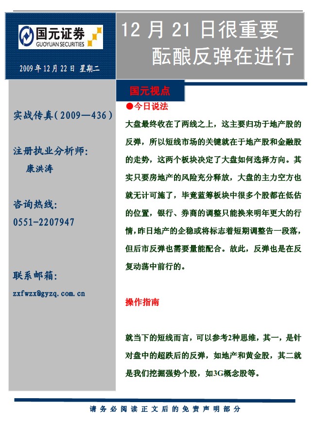 今日说法 大盘最终收在了两线之上,这主要归功于地产股的反弹,所以短线市场的关键就在于地产股和金融股的走势,这两个板块决定了大盘如何选择方向。其实只要房地产的风险充分释放,大盘的主力空方也就无计可施了,毕竟蓝筹板块中很多个股都在低估的位置,银行、券商的调整只能换来明年更大的行情, 昨日地产的企稳或将标志着短期调整告一段落,但后市反弹也需要量能配合。故此,反弹也是在反复动荡中前行的......