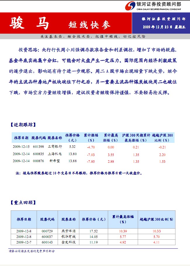 12月23日银河证券骏马(短线快参)