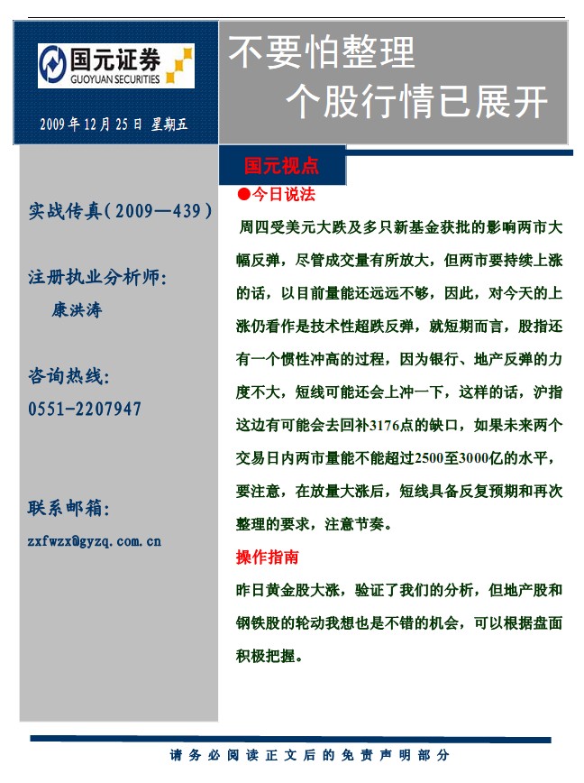 今日说法 周四受美元大跌及多只新基金获批的影响两市大幅反弹,尽管成交量有所放大,但两市要持续上涨的话,以目前量能还远远不够,因此,对今天的上涨仍看作是技术性超跌反弹,就短期而言,股指还有一个惯性冲高的过程,因为银行、地产反弹的力度不大,短线可能还会上冲一下,这样的话,沪指这边有可能会去回补3176点的缺口,如果未来两个交易日内两市量能不能超过2500至3000亿的水平,要注意,在放量大涨后,短线具备反复预期和再次整理的要求,注意节奏。 操作指南 昨日黄金股大涨,验证了我们的分析,但地产股和钢铁股的轮动我想也是不错的机会,可以根据盘面积极把握.......