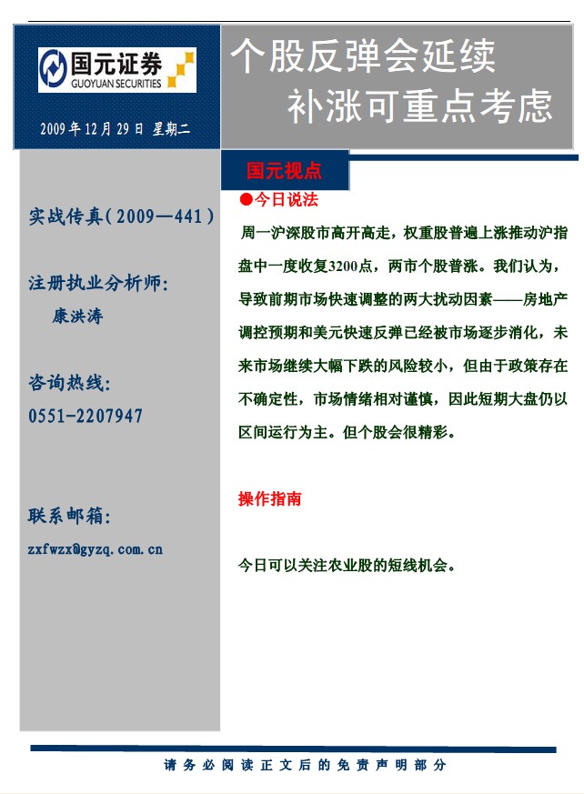 今日说法 周一沪深股市高开高走,权重股普遍上涨推动沪指盘中一度收复3200点,两市个股普涨。我们认为,导致前期市场快速调整的两大扰动因素——房地产调控预期和美元快速反弹已经被市场逐步消化,未来市场继续大幅下跌的风险较小,但由于政策存在不确定性,市场情绪相对谨慎,因此短期大盘仍以区间运行为主。但个股会很精彩.......