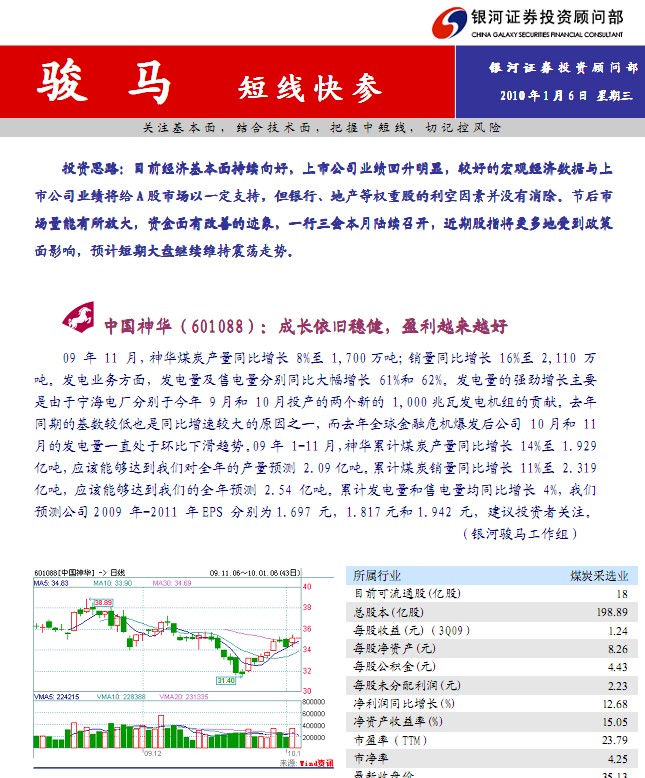 中国神华( 601088 ):成长依旧稳健,盈利越来越好 ): 09 年 11 月 , 神华煤炭产量同比增长 8% 至 1,700 万吨 ; 销量同比增长 16% 至 2,110 万吨。发电业务方面,发电量及售电量分别同比大幅增长 61% 和 62% 。发电量的强劲增长主要是由于宁海电厂分别于今年 9 月和 10 月投产的两个新的 1,000 兆瓦发电机组的贡献 。 去年同期的基数较低也是同比增速较大的原因之一 , 而去年全球金融危机爆发后公司 10 月和 1 1 月的发电量一直处于环比下滑趋势 。 09 年 1-11 月 , 神华累计煤炭产量同比增长 14% 至 1.92 9 亿吨 , 应该能够达到我们对全年的产量预测 2.09 亿吨 。 累计煤炭销量同比增长 11% 至 2.319 亿吨 , 应该能够达到我们的全年预测 2.54 亿吨 。 累计发电量和售电量均同比增长 4% , 我们预测公司 2009 年 -2011 年 EPS 分别为 1.697 元, 1.817 元和 1.942 元,建议投资者关注 ......