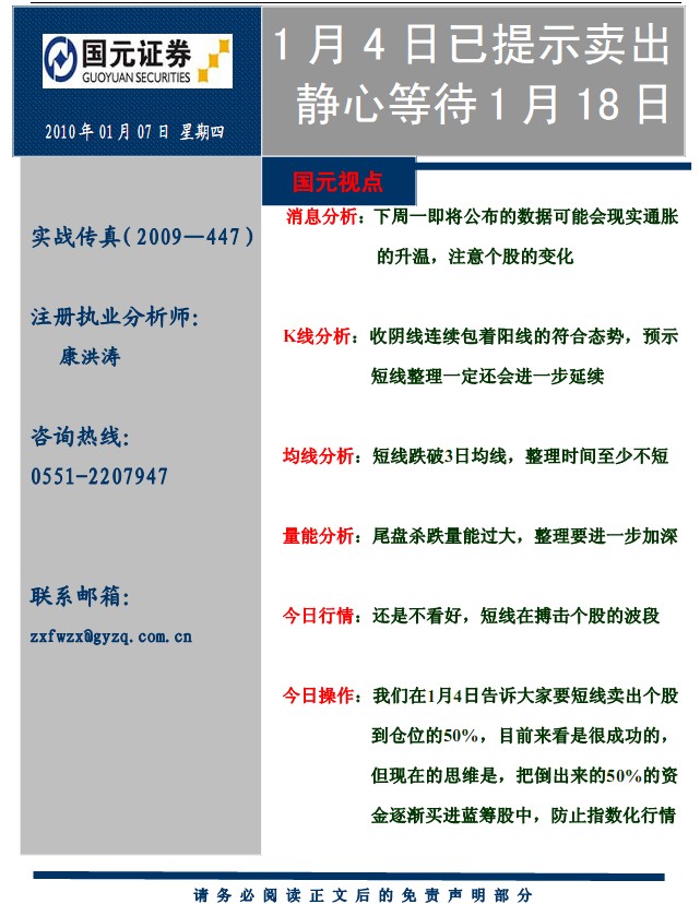 震荡中的个股也适合短线操作 下周初要公布12月份宏观经济数据,由于北方暴雪的原因,12月CPI普遍预期 会出现超预期增长,因此,不少人认为加息会提前到来。对此本栏认为可能 性不大,原因就在于在经济回升势头没有完全确立,加息很显然不合时宜。 更何况CPI超预期是偶然因素造成,不是常态。实际上适度的通胀对股市是有 好处的,特别是当CPI超过一年定期存款利率时,反而会促使银行储蓄资金的 回流股市。今日热点出现转移的现象,高科技板块出现调整和分化,从资金 的动向看,属正常的技术调整,后市依然看好。而其他版块确实也没能力调 动市场人气,大蓝筹板块相反还对指数做出了拖累,但我们依然尊重市场对 股指期货的预期,会对大蓝筹板块构成稳定的支撑,甚至局部走强,包括近期调整幅度不小的地产股,也都出现了回稳的动作。可以注意相关概念股的进一步走强,整理的时间还会延续,但目前是不具备深度的整理过程,可以进一步的挖掘个股的机会......