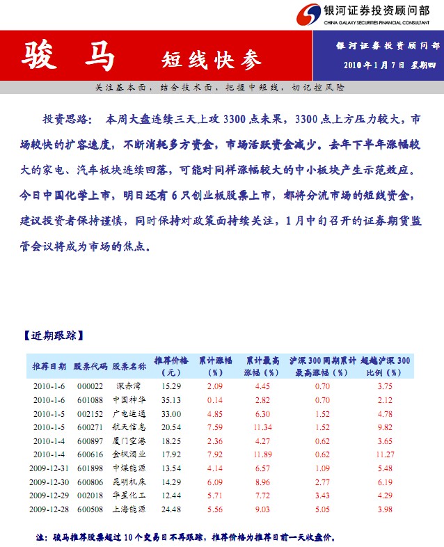 投资思路:本周大盘连续三天上攻 3300 点未果,3300 点上方压力较大,市场较快的扩容速度,市场活跃资金减少。 不断消耗多方资金,市场活跃资金减少。去年下半年涨幅较大的家电、汽车板块连续回落,可能对同样涨幅较大的中小板块产生示范效应。今日中国化学上市,明日还有 6 只创业板股票上市,都将分流市场的短线资金,建议投资者保持谨慎,同时保持对政策面持续关注,1 月中旬召开的证券期货监管会议将成为市场的焦点......