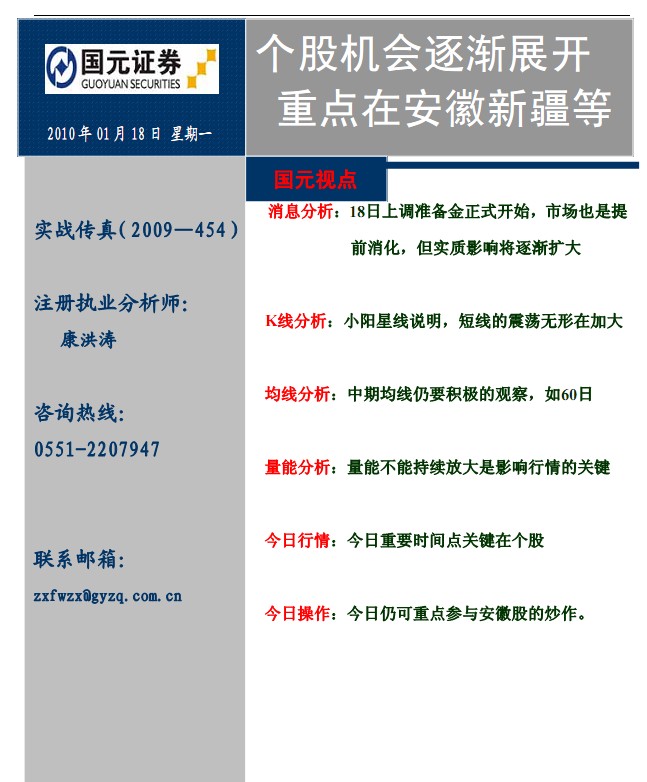 国元视点消息分析:18日上调准备金正式开始,市场也是提前消化,但实质影响将逐渐扩大 K线分析:小阳星线说明,短线的震荡无形在加大 均线分析:中期均线仍要积极的观察,如60日 量能分析:量能不能持续放大是影响行情的关键 今日行情:今日重要时间点关键在个股 今日操作:今日仍可重点参与安徽股的炒作......