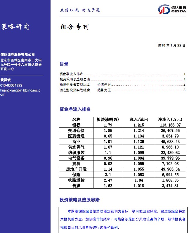 1月22日信达证券组合专刊
