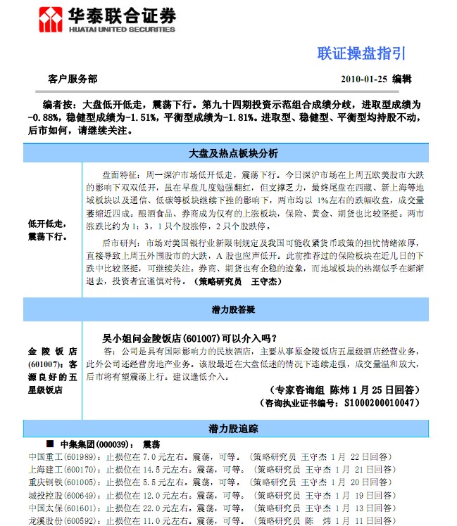 盘面特征:周一深沪市场低开低走,震荡下行。今日深沪市场在上周五欧美股市大跌的影响下双双低开,虽在早盘几度勉强翻红,但支撑乏力,最终尾盘在西藏、新上海等地域板块以及通信、低碳等板块继续下挫的影响下,两市均以 1%左右的跌幅收盘,成交量萎缩近四成。酿酒食品、券商成为仅有的上涨板块,保险、黄金、期货也比较坚挺。两市涨跌比约为 1:3,1 只个股涨停,2 只个股跌停。 后市研判:市场对美国银行业新限制规定及我国可能收紧货币政策的担忧情绪浓厚,直接导致上周五外围股市的大跌,A 股也应声低开。此前推荐过的保险板块在近几日的下跌中比较坚挺,可继续关注。券商、期货也有企稳的迹象,而地域板块的热潮似乎在渐渐退去,投资者宜谨慎对待........