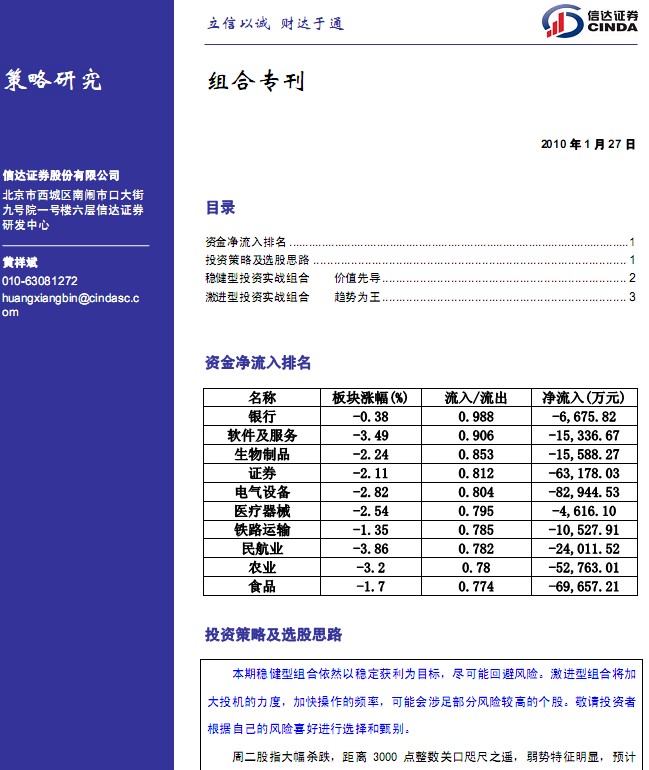 本期稳健型组合依然以稳定获利为目标,尽可能回避风险。激进型组合将加大投机的力度,加快操作的频率,可能会涉足部分风险较高的个股。敬请投资者根据自己的风险喜好进行选择和甄别。 周二股指大幅杀跌,距离 3000 点整数关口咫尺之遥,弱势特征明显,预计后市在 3000 点区域会有反复。保持低仓位,重点关注一些主题投资性板块的操作机会.......